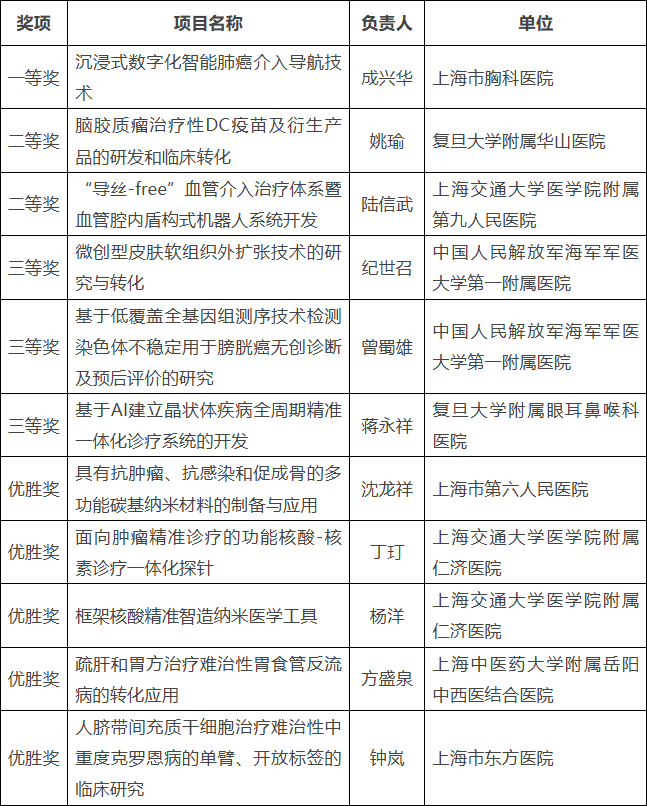 为进一步发现培养医学创新人才,激发本市医疗卫生机构科技成果转化动力,促进医学创新与产业资源深度融合,打造具有国际影响力的医学高地,在市委人才工作领导小组办公室指导下,市卫生健康委联合市科委、市经济信息化委、市知识产权局、市药品监管局共同举办了“春昇杯”医学创新人才大赛(2025•上海)。经初赛、复赛和决赛,“沉浸式数字化智能肺癌介入导航技术”等12个项目分别获一等奖、二等奖和三等奖,“具有抗肿瘤、抗感染和促成骨的多功能碳基纳米材料的制备与应用”等12个项目获优胜奖(名单见附件)。