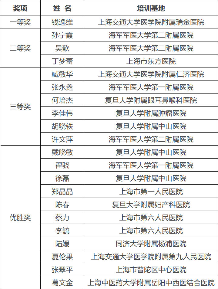 为推动本市毕业后医学教育工作,助力师资临床带教能力提升,在全市医疗卫生机构营造重师资、重带教、重传承的良好氛围,市卫生健康委、市中医药管理局、市疾控局共同举办了2025年“卓育杯”上海市毕业后医学教育师资临床带教能力大赛。经基地推荐、初赛和决赛,共决出一等奖1名,二等奖3名,三等奖6名和优胜奖11名(名单见附件)。